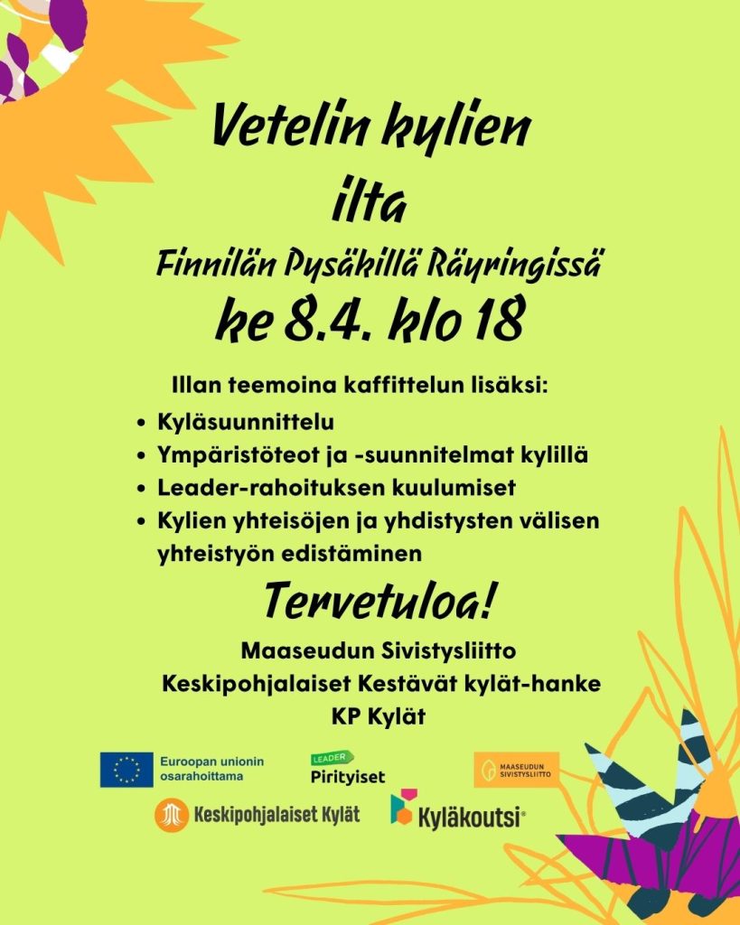 Maaseudun sivistysliiton Keskipohjalaiset kestävät kylät -hanke, Keskipohjalaiset Kylät ja Pirityiset järjestävät Vetelin Räyringissä 8.4. kylien yhteinen illan, jossa kylät pääsevät keskustelemaan ja pohtimaan yhteistyön mahdollisuuksia. Samassa tilaisuudessa perehdytään kyläsuunnitelmaan useasta näkökulmasta. Kyläsuunnitelma kun voi olla yhtä aikaa sekä yleisluontoinen näkemys kehittämistarpeista ja -keinoista, myös ympäristösuunnitelma, turvallisuussuunnitelma ja vaikkapa vastuullisuussuunnitelma. Kukin kylä tekee omannäköisensä dokumentin, joka voi olla myös ulkoasultaan moninainen.